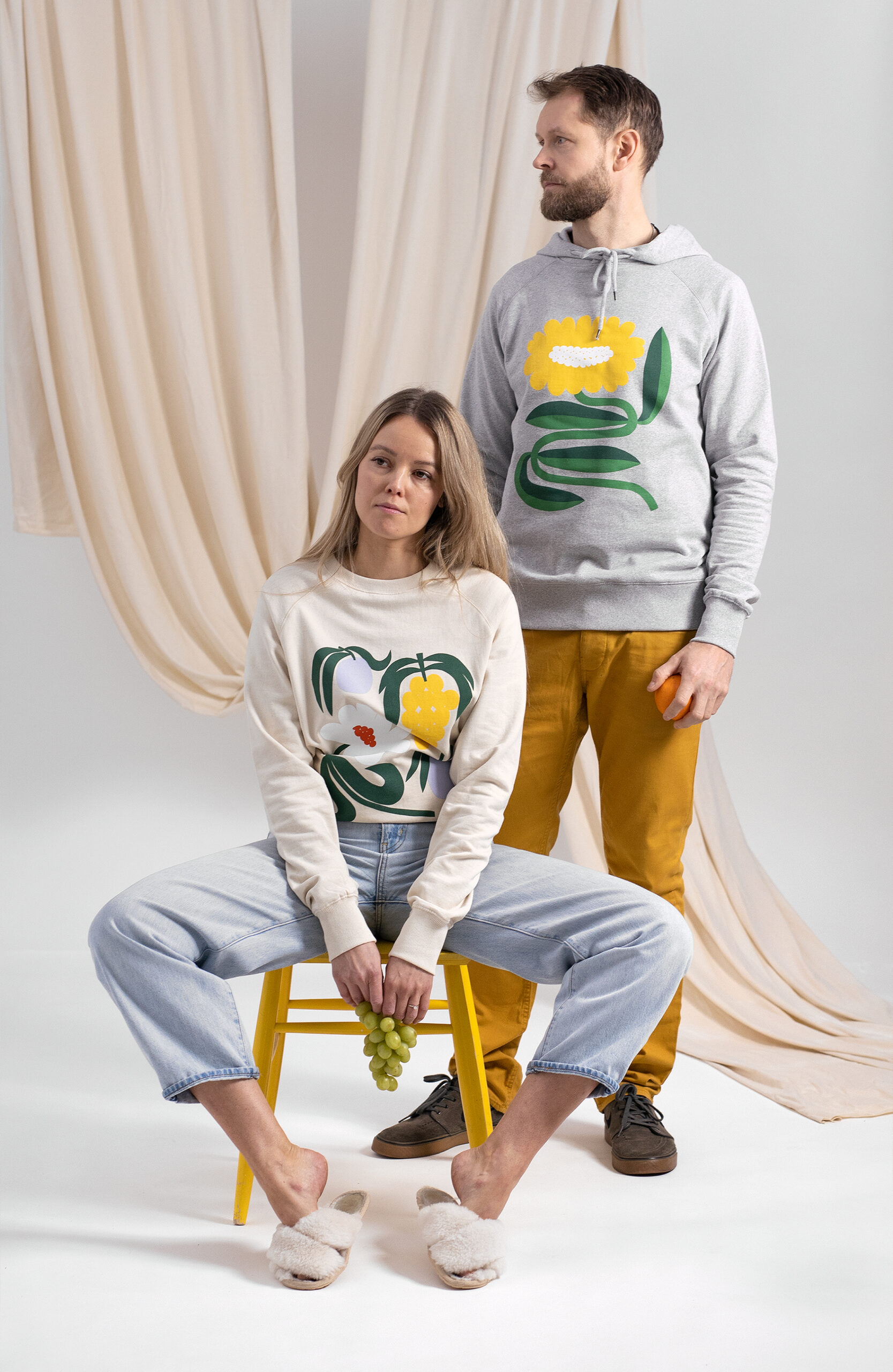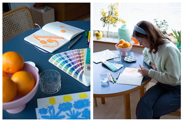 Lotta has been interested in colours since she was a child. She does not consider herself a technical draughtsperson; instead, she combines colours as she sees fit. Her works combine the styles of still life, pattern design and the examination of movement and arrangements. Colours are at the heart of her works. In addition to colours, fruits and flowers are repeated patterns in Lotta’s prints, stemming from still life, which often depicts moments of standstill.