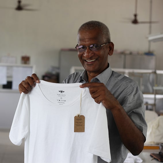 Under the guidance of Mr Wenkat, who still serves as the factory director, we expanded our operations in India. In this picture taken in 2014, Mr Wenkat proudly holds up our first t-shirt at the old factory in Palladam. This partnership allowed us to scale up production and improve the quality of our recycled textiles, paving the way for our continued growth and success.