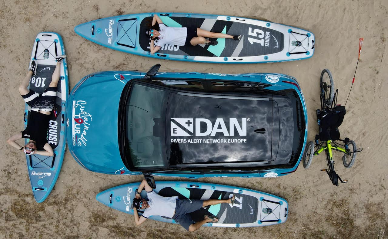 Tiemme kohtasivat DAN Europen Sustainable Tour -projektin aikana, jonka tavoitteena on lisätä tietoisuutta tarpeesta vähentää merkittävästi hiilidioksidipäästöjämme, mikäli haluamme säilyttää terveet valtameret. Tätä aloitetta varten DAN Europen Manu Bustelo ja Alana Alvarez matkustivat ympäri Eurooppaa sähköautolla – lataamalla sitä vain uusiutuvalla energialla – ja tapasivat asianomaisia sidosryhmiä ajaakseen muutosta, jota me kaikki tarvitsemme.